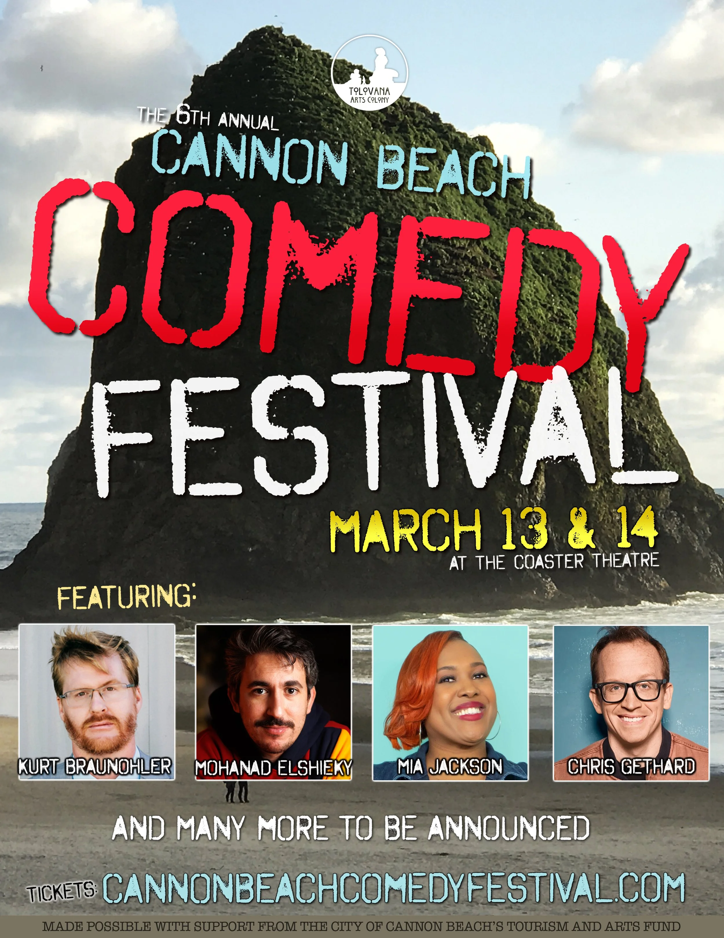 The Cannon Beach Comedy Festival is produced by the nonprofit Tolovana Arts Colony and made possible by a grant from the City of Cannon Beach's Tourism and Arts Fund (it's what makes these tickets so affordable).